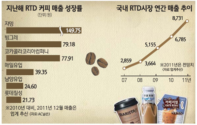 24일 시장 조사업체인 AC닐슨이 대형마트와 슈퍼, 편의점, 백화점에서 판매된 RTD커피음료의 지난해 매출(12월은 업계 추산)을 집계해 전년 대비 성장률을 조사한 결과, 쟈뎅과 빙그레가 큰 폭으로 성장했으며 이 시장 선발 주자로 꼽히는 롯데칠성, 남양유업, 매일유업 등도 모두 20~40% 수준의 매출 증가율을 기록했다.