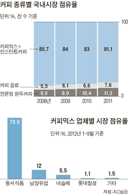 커피믹스 시장은 1998년 외환위기 직후부터 본격 성장했다. 그 전에는 동서식품의 맥스웰하우스와 네슬레의 테이스터스초이스라는 인스턴트 커피가 대세였다. 하지만 외환위기를 딛고 일어서는 과정에서 기업들이 인력 구조조정을 하며 사무실에 커피를 탈 일손이 사라지자 커피믹스가 '사무실 커피'의 대명사로 자리 잡게 됐다. 그런 커피믹스 시장은 지지난해 말까지만 해도 동서식품과 네슬레의 독무대였다. 동서식품 '맥심' 80%, 네슬레의 '테이스터스 초이스' 15%란 시장점유율이 흔들리지 않았다.