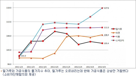 단순 비교를 해봐도 밀가루 가격은 20년 동안 3배도 채 오르지 않았는데, 새우깡은 가격이 5배가 오르는 등 가공식품의 가격은 밀가루 가격 상승 폭을 훌쩍 뛰어넘었다. 지난 2008년 전세계를 휩쓴 곡물파동 당시 밀가루 값은 포대 당 2만2천원 대로 크게 뛰어올랐고, 식품업체들은 원가 상승을 이유로 라면과 과자, 식빵 등 밀가루 가공식품 값을 일제히 올렸다.