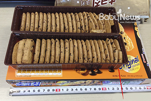 | 오리온 '초코칩 쿠키'는 총 길이 18.5cm 중 약 4.5cm가 빈공간이었다. 양 옆의 공간을 계산하지 않더라도 빈공간의 비율이 24%가 넘는 셈. 이처럼 제조업체들의 과대포장 꼼수는 여전했다. ⓒ컨슈머리서치 |