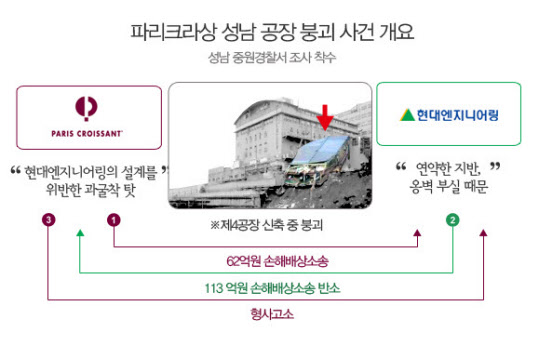 파리크라상은 고소장에서 "현대엔지니어링이 흙막이를 지탱하기 위한 구조물을 설치하기도 전에 과도한 굴착을 시행하는 바람에 지지할 곳이 없어져 공장이 붕괴됐다"며 "연암 파쇄대(연약한 지반)의 존재를 알면서도 이에 대한 주의의무를 위반했다"고 주장했다.