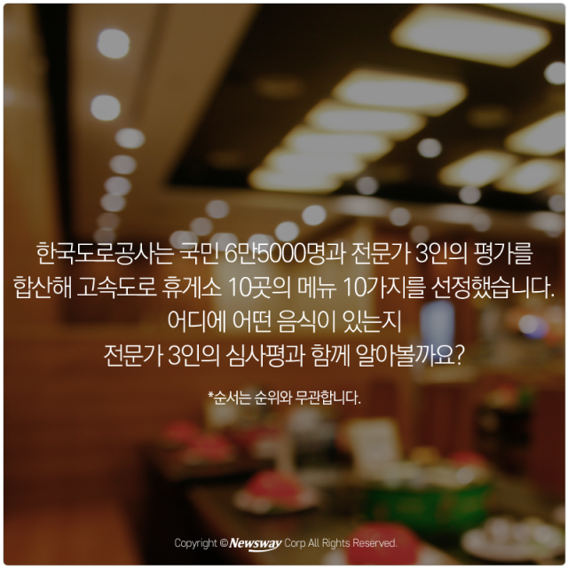 한국도로공사는 국민 6만5000명과 전문가 3인의 평가를 합산해 고속도로 휴게소 10곳의 메뉴 10가지를 선정했습니다. 어디에 어떤 음식이 있는지 전문가 3인의 심사평과 함께 알아볼까요?