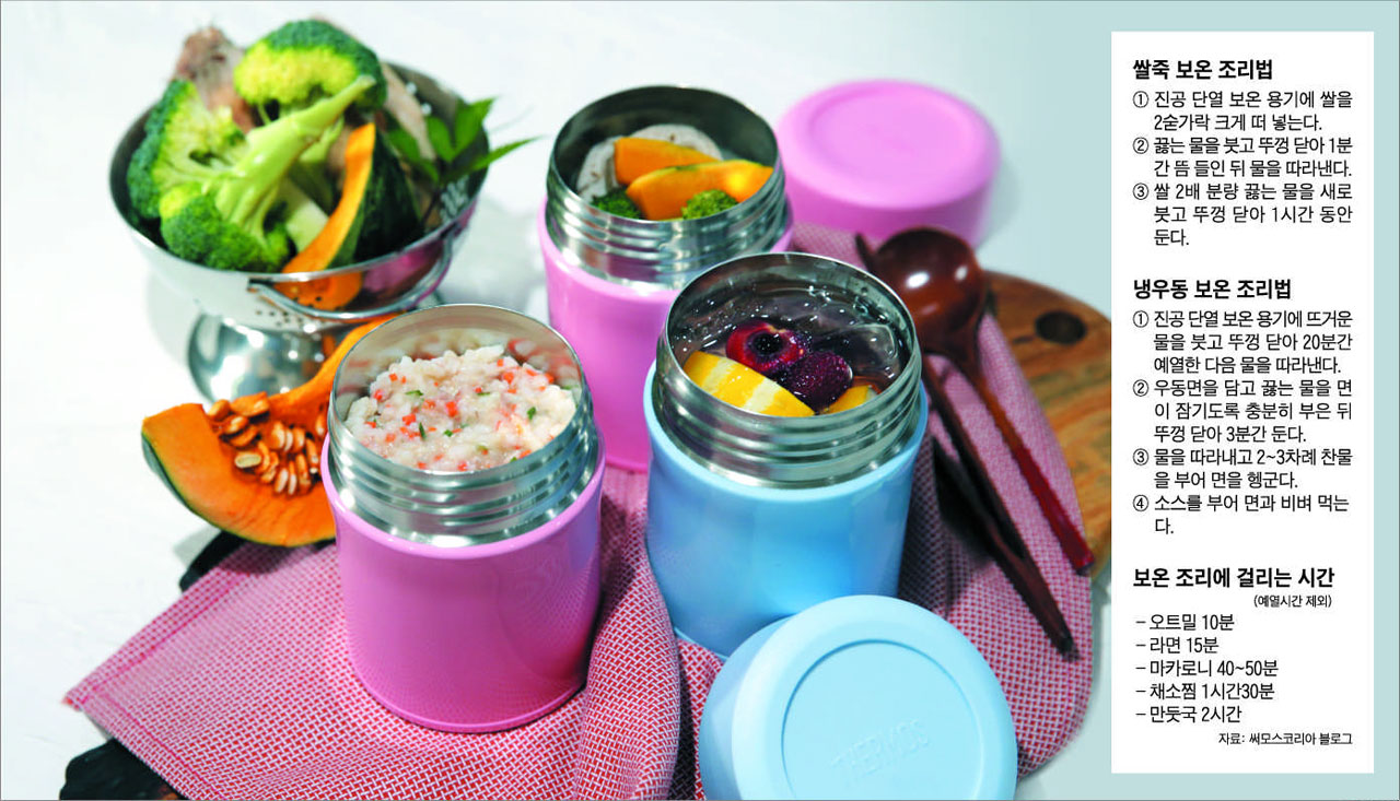 일본에선 4년 전부터 유행해 수프, 스튜, 푸딩 등 여러 조리법을 담은 책도 출간됐다. 국내선 최근 관심을 끌고 있다. 다양한 보온조리를 시도해봤다는 요리연구가 이보은씨는 "설마 했는데 의외로 요리가 잘돼요. 죽이나 젊은 여성들 다이어트식으로 인기 많은 채소찜 만들기에 딱이에요"라고 했다. 이씨와 함께 보온조리에 직접 도전해봤다.