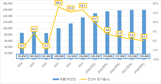 일본 도넛 시장 규모는 2023년 1360억 엔을 기록했으며, 2017년 이후 전반적으로 성장세를 보이고 있다. 2024년에는 1492억 엔을 기록할 것으로 전망된 바 있으며, 2025년에는 1548억 엔 규모로 확대될 것으로 예측된다. 이에 따라 일본 내 최신 도넛 트렌드가 소비자들의 관심을 끌고 있으며, 관련 업계에서도 다양한 신제품을 출시하고 적극적으로 마케팅 전략을 펼치고 있다.