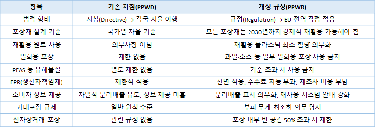 유럽연합(EU)은 포장폐기물과 원자재 낭비를 줄이고 순환경제로의 전환을 촉진하기 위해 기존의 포장 및 포장폐기물 지침(PPWD)을 대체하는