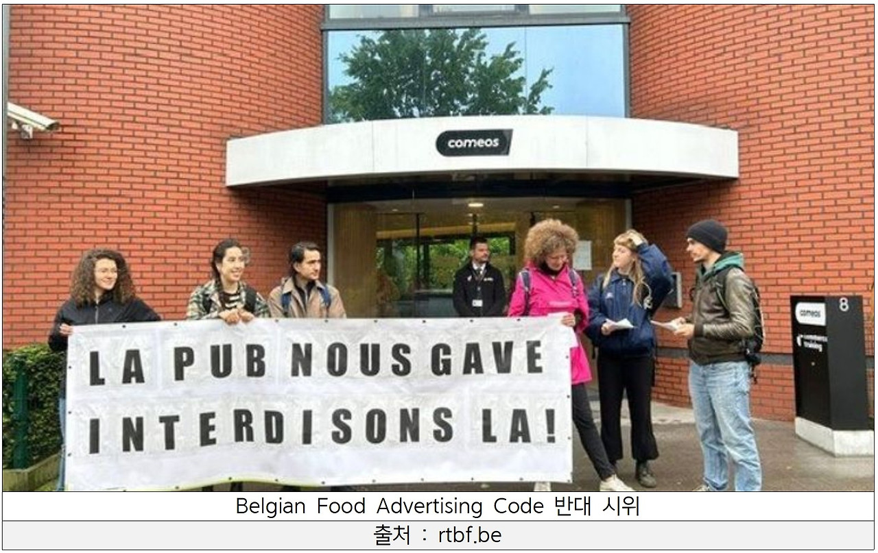 2026년 1월 1일부터 벨기에 식품 광고 강령(Belgian Food Advertising Code)이 시행된다. 이는 아동 건강 보호를 목적으로 기존 벨기에 서약(Belgian Pledge)을 강화한 것인데, 16세 미만 아동을 대상으로 한 HFSS 식품(products high in fat, salt or sugar; 지방, 염분, 당류 함량이 높은 식품) 광고를 금지한다. 대표적으로 초콜릿, 사탕, 과자, 아이스크림, 주스, 꿀, 잼, 아침용 시리얼 등이 HFSS 식품에 포함된다. 해당 강령은 벨기에 식품, 광고 업계 주요 협회인 Fevia(식품 산업 협회), UBA(광고 산업 협회), Comeos(도소매업 협회), Conseil de la Publicité(광고 협의회)가 모여 합의한 자율 규제이다. 광고 업계 종사자와 시민 절반으로 이루어진 Jury d'Éthique Publicitaire(광고 윤리 심의 위원회)가 준수 여부를 감독한다.
