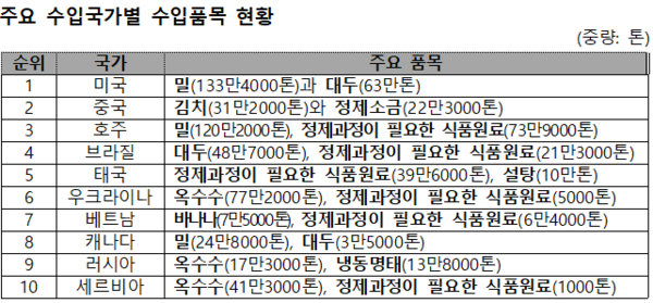 지난해 총 2369개 품목이 수입됐는데, 이 중 상위 5개 품목은 밀, 정제과정이 필요한 식품원료, 옥수수, 대두, 바나나로, 이들 수입량이 전체의 46.4%(약 900만톤)를 차지, 주로 원료성 식품이 수입되는 것으로 나타났다.