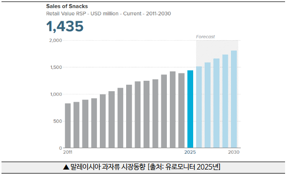 ❍ 시장조사기관인 유로모니터에 따르면 말레이시아 과자류 시장 규모는 2024년 기준 13.4억불 수준이며 연간 5.7%씩 성장하여
