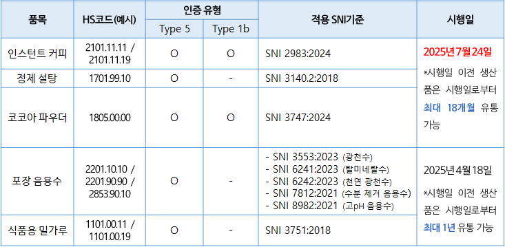 인도네시아 산업부는 2025년 1월-6월에 걸쳐 인스턴트커피, 정제설탕, 코코아파우더, 포장 음용수(생수, 미네랄워터) 등의 품목에 대해 국가표준(SNI, Standar Nasional Idonesia)인증을 의무화 하는 산업부 장관령을 WTO에 통보하였음. 이는 식품안전 및 품질 보장을 위한 것으로 인도네시아 국내 생산 및 수입되는 제품에 대해 반드시 SNI인증(Type5 또는 Type1b)을 취득하도록 함.