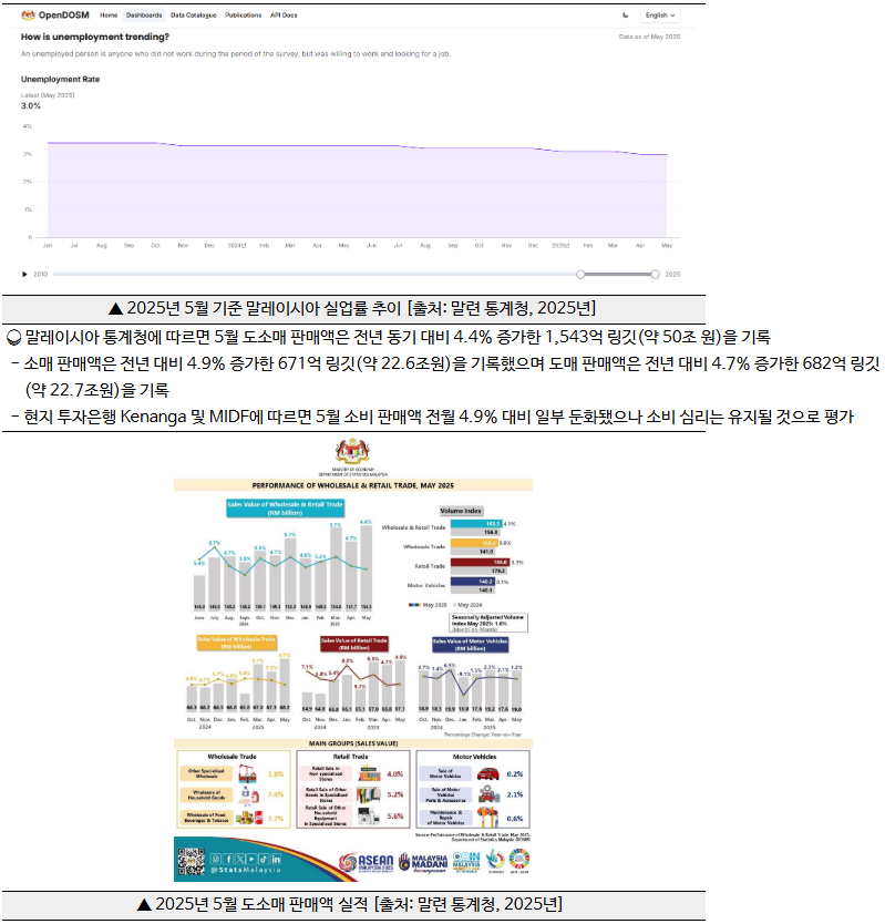 - 말레이시아 통계청(DOSM)에 따르면 5월 실업률은 3%로 유지되고 있으며 전월 대비 0.7% 감소한 522,400명을 기록