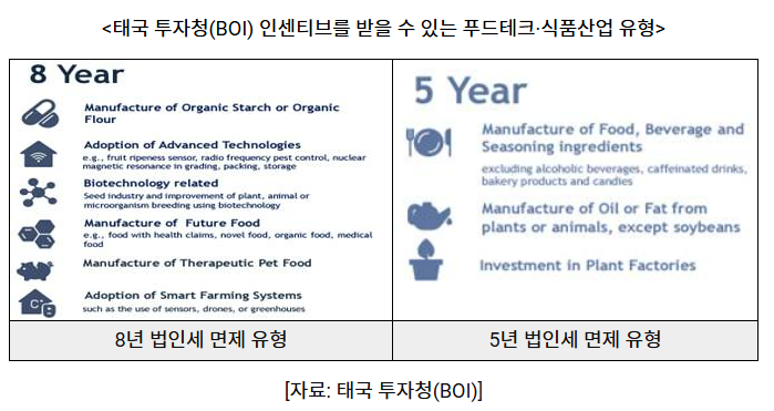 | ◦ 푸드테크 관련 태국 투자 기업은 5년 또는 8년 법인소득세(CIT) 면제 혜택 ◦ 8년 법인세 면제 유형: 유기농 전분·밀가루 제조, 혁신 기술 활용, 바이오테크놀로지, 미래식품 제조, 치료용 반려동물 식품 제조, 스마트팜 기술 활용 ◦ 5년 법인세 면제 유형: 식품·음료 제조, 동·식물 유래油제조, 플랜트 팩토리 ◦ 이외 추가 혜택으로는 기계, 연구개발(R&D)에 사용되는 원자재 및 수출 생산용 원자재에 대한 수입 관세 면제 등이 있으며, 토지 소유 허가, 숙련 노동자 및 전문가의 태국 영입 등 다양한 비과세 인센티브도 제공하고 있음 |