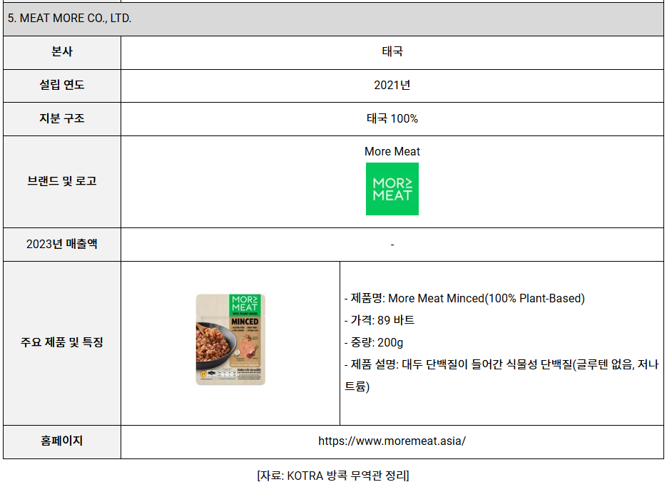 태국 내 식물성 단백질 또한 큰 인기를 끌고 있으며, 식물성 단백질은 주로 대두, 밀, 완두콩, 버섯, 마이코프로틴(곰팡이 단백질)과 같은 재료로 만들어진다. 이러한 트렌드의 주요 원인은 태국 인구의 약 4분의 1을 차지하고 있는 '플렉시테리안' 때문인 것으로 분석됨, 이들은 엄격하게 채식을 지키는 것은 아니지만 건강 또는 환경상의 이유로 육류 섭취를 줄이는 것을 목표로 한다. 이들은 건강한 라이프스타일을 유지하기 위한 옵션으로 식물성 단백질을 선호함, 식물성 단백질은 단백질 함량이 높지만 콜레스테롤과 지방 함량이 낮다. 환경을 생각하는 소비자들은 가축 사육이 발생시키는 환경오염을 인지하고, 육류에 비해 적은 토지와 자원을 필요로 하는 식물성 육류에 매력을 느끼고 있다. 인기 있는 식물성 대체육 브랜드는 미트 아바타, 모어 미트, 미트 제로 등이 있다