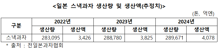 2023년에 처음으로 5천억엔을 돌파한 스낵과자 시장은 2024년도 금액, 수량 모두 증가했다. 전일본과자협회(全日本菓子協会)에서 발표한 통계자료에 따르면 2024년도 스낵과자 생산량은 28만 9,671톤으로 전년대비 0.3% 증가했으며, 생산액은 4,078억엔으로 전년대비 6.6% 증가했다.