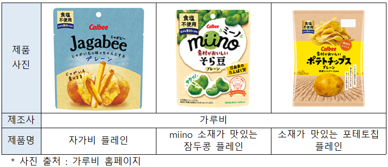 올해 3월, 현지 주요 제조업체인 가루비(カルビー, Calbee)에서는 식염을 사용하지 않은 제품, ‘휴염 간식(休塩おやつ)’ 시리즈를 출시했다. 가루비에서는 스낵과자를 고를 때, 염분을 신경 쓰는 소비자가 많은 반면, 소금을 사용하지 않거나 줄인 과자가 적은 점에 착안하여 본 제품을 개발했다. 또한 재료의 맛을 즐기고자 하는 소비자도 서브 타겟으로 설정했다.