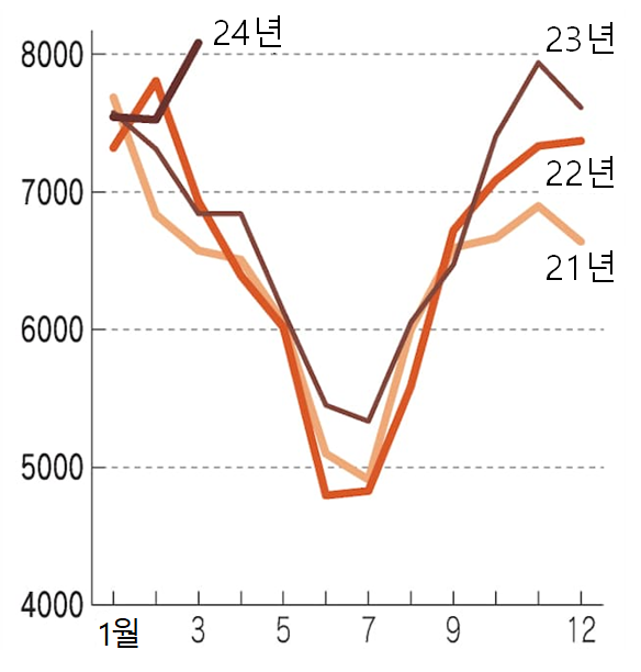 | 2 | 태국 | 8,549 | 10.86 | 7,787 | 9.26 | 7,950 | 8.59 |
