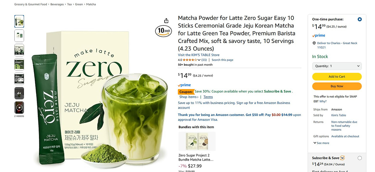 <미국 아마존에서 판매되고 있는 메이크 라테 제로슈가 제주 말차 제품>