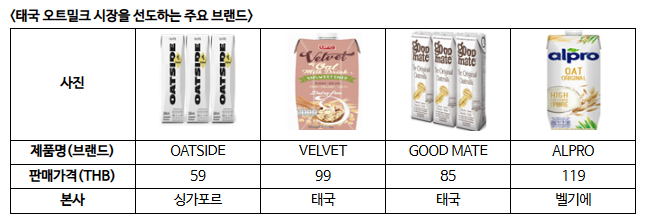 ㅇ 이러한 흐름을 촉진시킨 주요 요인 중 하나는 태국에서 주목받고 있는 오트밀크 브랜드 Oatside의 가격 인하였다. Oatside는 1리터 제품의 가격을 기존 115바트(한화 약 4,900원)에서 59바트(한화 약 2,500원)로 대폭 낮추며, 프리미엄 식물성 대체 우유 식품의 진입 장벽을 크게 낮췄다.