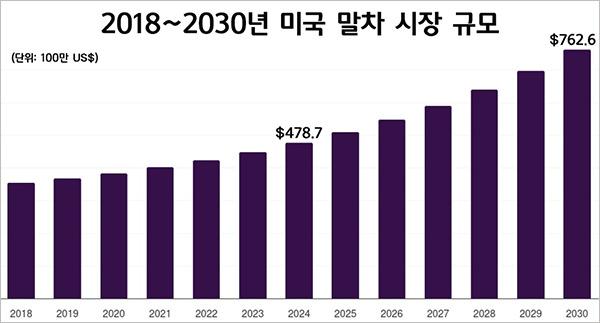 코트라 뉴욕무역관이 인용한 그랜드뷰리서치 보고서에 따르면, 미국의 말차 시장은 2024년 한화 약 6645억 원 규모로 세계 시장의 22.5%를 차지했다. 보고서는 또 2030년까지 연평균 8.3% 성장해 1조 원 규모를 넘어설 것으로 내다봤다. 제품 타입 별로는 파우더 제품이 전체 매출 가운데 가장 큰 비중을 차지했으며, 물이나 우유 등에 섞어서 완성 시키는 인스턴트 프리믹스 제품이 가장 높은 성장세를 기록할 것으로 전망된다.
