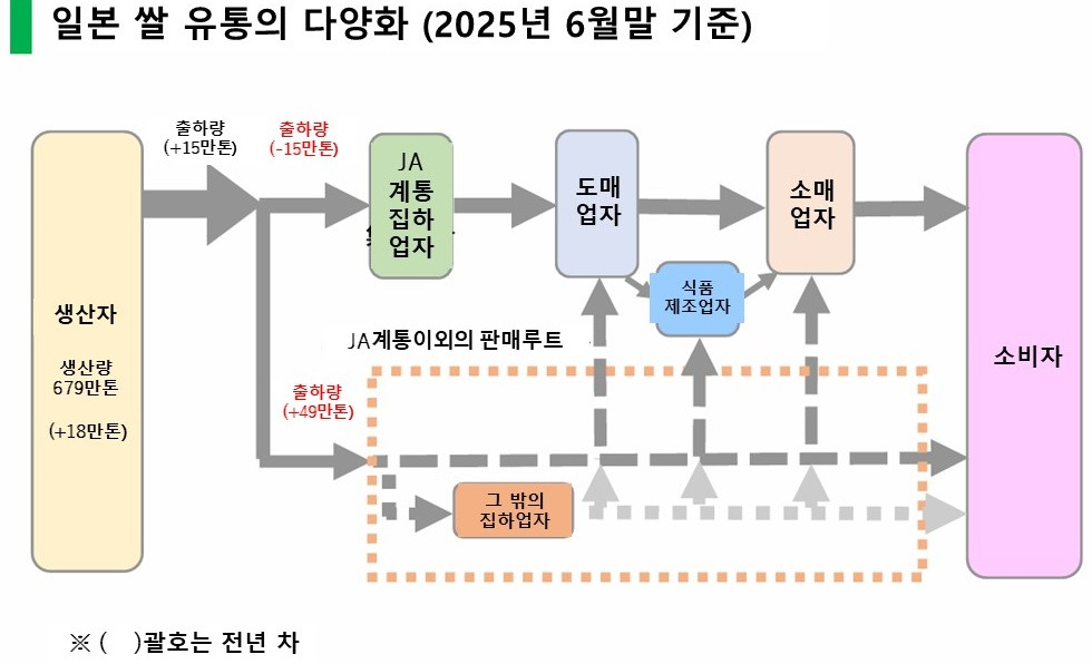 일본 후지 경제연구소의 조사에 따르면 일본 쌀의 시장 규모는 2024년 1,867억 엔에서 2025년에는 1,989억 엔으로 늘어날 전망이며, 2026년에는 2,000억 엔을 돌파할 것으로 예상하고 있습니다. 유통에서도 과정의 다양화가 진행되고 있는 가운데, 생산자의 출하량 중에서 JA 계통의 집하 업자로의 출하량 수는 많이 감소(전년 대비 –34만 톤)한 데 비해 생산자의 직접판매와 집하 업자 이외의 업자와의 거래는 크게 늘었습니다. (전년 대비 +49만 톤)