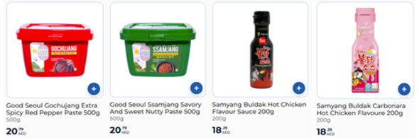 한국 소스의 경우, 까르푸(Carrefour) 온라인몰과 주요 하이퍼마켓 매대에 삼양 불닭소스, 굿서울(Good Seoul) 고추장·쌈장 등 한국식 매운맛과 발효 소스가 판매 중이다. 삼양 불닭 핫 치킨 소스(200g)는 약 18디르함(약 5달러)에, 굿서울 고추장(500g)과 쌈장은 각각 20디르함(약 5달러)대 가격으로 유통되고 있다. 온라인몰에는 ‘Korean Food’ 섹션이 따로 마련될 정도로 관심이 높아졌다. 하지만 UAE 소스 시장에서 한국 브랜드의 점유율은 아직 미미하다. 글로벌 브랜드가 대형 유통망과 마케팅으로 시장을 주도하는 만큼, 한국 소스가 단독 점유율을 확보하기에는 아직 경쟁력이 약하다.
