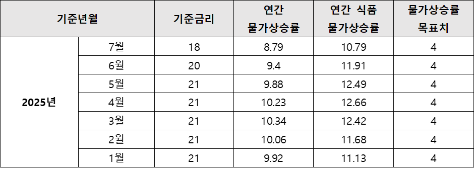 2025년 러시아 기준금리 및 연간 물가상승률(단위: %)