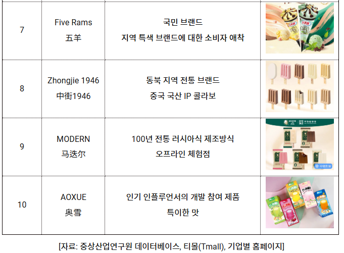 중국 아이스크림 시장은 외국 브랜드와 현지 브랜드가 경쟁하는 양상을 보이고 있다. Yili, Mengniu를 대표로 하는 중국 브랜드는 폭넓은 가격대와 채널 우위를 바탕으로 꾸준히 상위권을 유지하고 있으며, Wall’s, Häagen-Dazs 등 외국 브랜드는 고급화와 현지화를 결합해 세분화된 시장을 점유하고 있다. 신흥 세력인 Zhongjie 1946, AOXUE는 새로운 맛 개발, 애국소비 IP 콜라보레이션 및 인플루언서 마케팅으로 빠르게 성장하고 있으며, Bright, Five Rams와 같은 전통 브랜드는 감성 마케팅과 건강을 강조한 제품 업그레이드를 통해 지역 우위를 강화하고 있다.