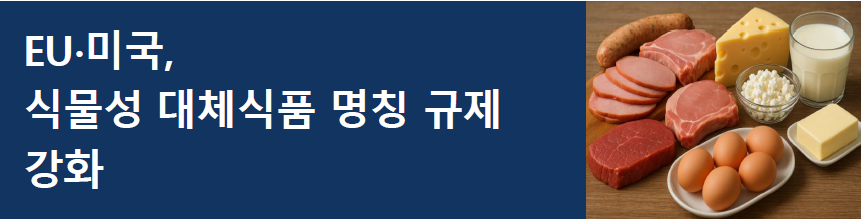 EU는 2025년 7월 17일 공동농업정책(CAP, Common Agricultural Policy) 패키지에 포함된 제안문 ‘COM(2025)553 final’에서 식물성 대체식품에 29개 육류 관련 용어 사용을 제한하는 내용을 발표함. 동시에 미국 상원은 7월 29일 식물성 제품의 유제품 명칭 사용 금지를 FDA 집행으로 의무화하는 「DAIRY PRIDE Act(2025)」를 재발의함.