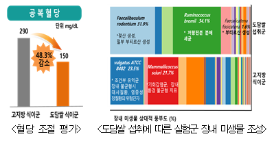 연구진은 동물실험에서 고지방식과 ‘도담쌀’ 사료를 8주간 함께 먹인 실험군의 공복 혈당이 고지방식만 한 실험군보다 48.3%(150mg/dL) 낮아지는 것을 확인했다. 혈당 조절 호르몬 분비를 촉진하는 부티르산을 만드는 유익균 수치는 약 2.8배 늘어났다.