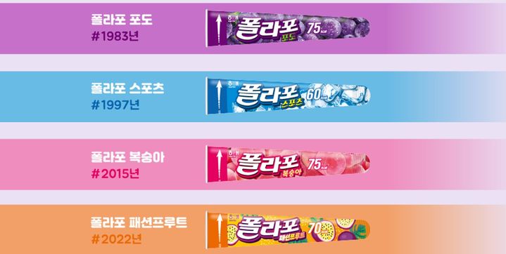 1983년 폴라포 포도로 시작한 폴라포는 ▲1997년 폴라포 스포츠(소다맛) ▲2015년 폴라포 복숭아 ▲2022년 폴라포 패션프루츠를 출시하며 라인업을 이어가고 있다.