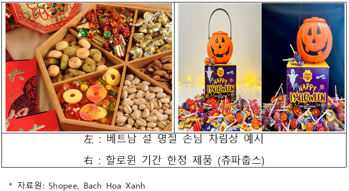 - 베트남의 제사 및 주요 명절에 빠질 수 없는 제품은 캔디로 베트남 소비시장에서 캔디류 제품이 차지하고 있는 영향은 매우 크며, 다양한 제품군을 통해 현지 소비자들의 구매를 유도하고 있는 시장 경쟁력이 매우 높은 시장임