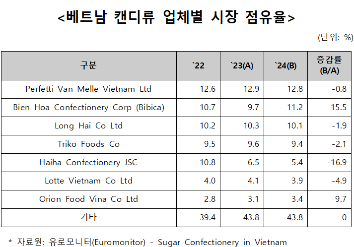 - 베트남 현지에서 인지도가 높은 업체는 멘토스, 츄파춥스, Alpenliebe 등의 브랜드를 보유하고 있는 Perfetti Van Melle Vietnam Ltd사가 전체 시장의 12.8%를 점유하고 있는 것으로 확인되며, 뒤이어 MIGITA, AHHA, ZOO와 같은 브랜드를 보유하고 있는 Bien Hoa Confectionery Corp사가 11.2%의 시장 점유율을 기록하였음. 한국계 제과업체인 Lotte Vietnam의 경우 3.9%의 점유율을 기록하였으며, Orion Food Vina사는 3.4%의 점유율을 기록하였음