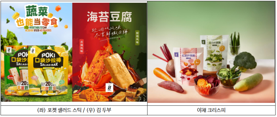 최근 싱치링(星期零)은 포켓 샐러드 스틱, 김 두부, 계란 두부, 식물성 소고기, 야채 크리스피 스낵 등 다양한 식물성 신제품들을 중국 프리미엄 유통채널인 올레(ole')에 선보이며 상온 스낵, 냉장 즉석식품 등 다양한 카테고리와 소비 시장을 아우르는 라인업을 공개했다.