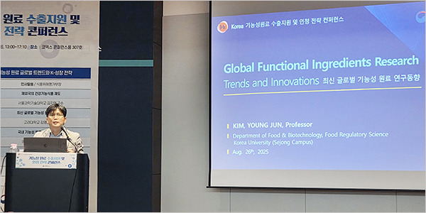 지난달 26일 'K-Health Conference 2025'의 부대행사로 진행된 식품의약품안전평가원 주최의 '기능성 원료 수출지원 및 인정 전략 컨퍼런스'에서 ‘최신 글로벌 기능성 원료 연구동향’을 주제로 발표한 고려대학교 김영준 교수는 국내 건강기능식품 시장의 위기를 지적했다. 전 세계 시장이 연 4% 이상 성장하는 반면, 국내 시장은 2023년을 기점으로 성장이 꺾이는 추세라고 밝혔다. 특히 건강기능식품 시장의 수입액이 수출액보다 3배가량 많은 심각한 무역 불균형 상태를 지적하며, 이를 타개하기 위한 거시적인 전략이 시급하다고 강조했다.