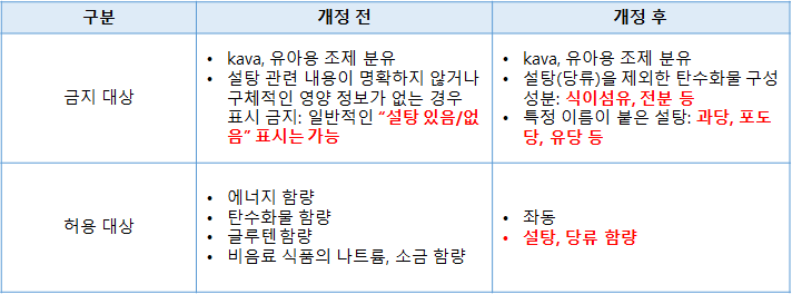 - 기존 규정에서는 ‘에너지, 탄수화물, 글루텐’만 영양 표시가 허용되었으나, 이번 개정에는 ‘설탕(또는 당류)’에 대한