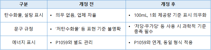 - P1059를 보완하여 알코올 음료의 탄수화물, 설탕 관련 표시의 허용 범위와 문구 사용 기준을 명시함