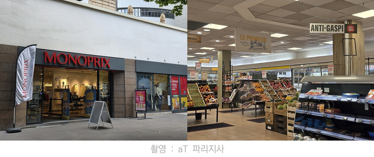 파리 인근 최대 업무 지구이자 다수의 열차 노선이 교차해 유동 인구가 많은 La Défense 지역의 Monoprix에 방문했다. Monoprix는 유통 기업 Casino의 자회사로, 식품 및 비식품을 모두 취급하며 가장 큰 매장인 Monoprix(321개), 식품 비중이 높고 매장 규모가 비교적 작은 Monop’(113개), 편의점처럼 매장 내 취식 공간이 마련되어 있는 Monop’ Daily(52개) 등이 프랑스 전역에 분포해 있다. 인접 국가 및 프랑스 해외 영토에 총 138개 매장을 운영하고 있기도 하다.