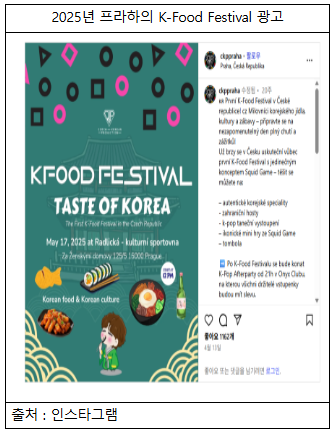 엑스파츠체코(Expats.cz)사의 기사에 따르면, 프라하의 ‘체코-코리아 프로덕션(Czech-Korean Production)’에서 주최한‘Taste of Korea 2025’는 K‑푸드, K‑팝 공연, ‘오징어 게임’ 테마 게임 등을 포함한 복합 문화 이벤트였으며, 이 행사의 K‑푸드 존은 떡볶이, 김치 등 한국 음식 체험 공간으로 구성되어, 현지 관광객의 긍정적 반응을 일으켰다고 전했다.