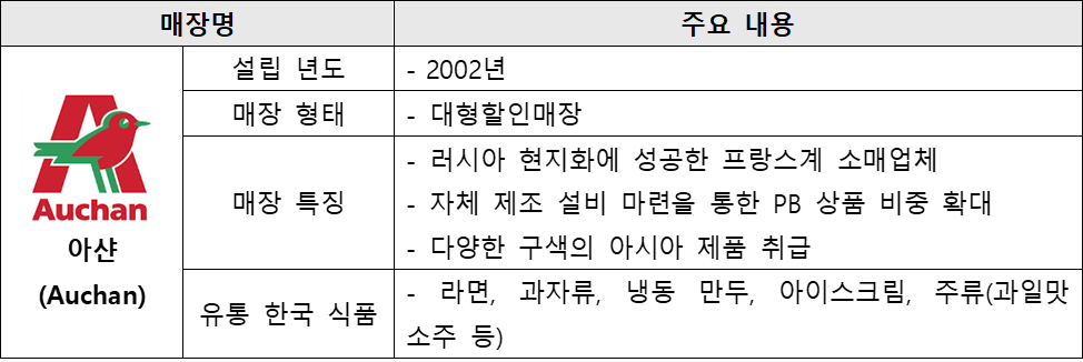 출처: Retail.ru. 게시기사 및 아샨(Auchan) 공식 홈페이지 참조 후 모스크바지사 작성