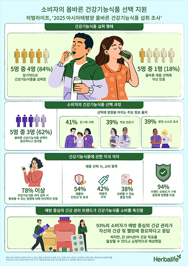 허벌라이프는 한국을 포함한 아시아태평양 11개국 소비자 9천여 명을 대상으로 진행한 ‘2025 아시아태평양 올바른 건강기능식품 섭취 설문조사’ 결과를 17일 발표했다. 이번 설문은 건기식 섭취 빈도, 제품 선택 기준, 신뢰하는 정보 출처 등 건기식 전반에 대한 소비자 인식을 조사했다.