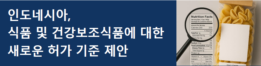 2025년 9월 초, 인도네시아 식품의약청(BPOM, Badan Pengawas Obat dan Makanan)은 식품 및 건강보조식품에 대한 허가 기준을 개정한 규정 초안을 발표함. 이는 BPOM 규정 제 10호(2021년)를 대체하며, 위험성 기반 접근 방식을 통해 승인 절차를 간소화하고 안전성과 품질 관리를 강화하는 것을 목표로 함