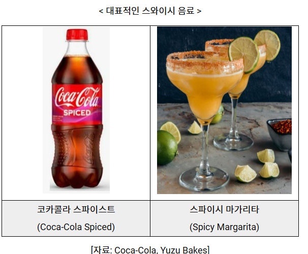 알콜이 들어간 성인 음료 시장에서는 이미 스와이시한 맛이 주류가 되었다. 미국의 바와 칵테일 업계에서 스파이시 마가리타(Spicy Margarita)가 꾸준히 인기를 얻는 것이 그 예중 하나다. 마가리타란 기본적으로 테킬라, 트리플 섹(오렌지 리큐어), 라임 주스로 만드는 클래식 칵테일이다. 스파이시 마가리타는 여기에 할라피뇨를 으깨 넣거나 칠리 인퓨즈드(Chile-infused) 테킬라 · 시럽, 타진(Tajín)* 등을 더해 매운맛을 입힌 음료로 최근 몇 년간 미국에서 대세 칵테일로 부상했다. 원래는 할라피뇨나 칠리 시럽으로 매운맛을 내는 것이 일반적이지만 뉴욕 인근의 K-푸드를 선보이는 스테이크하우스와 바에서는 바텐더들이 고추장 시럽을 활용해 단맛 · 훈연감 · 감칠맛을 동시에 구현하는 레시피도 선보이고 있다.
