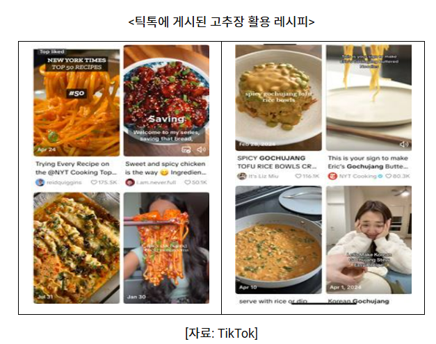 또한, 틱톡(TikTok)에서는 고추장을 활용한 레시피가 수백 건 이상 공유되면서 소고기밥, 두부밥, 파스타, 우동 등 국경을 넘나드는 다양한 퓨전 요리에 접목돼 소개된다. 고추장은 매콤하면서도 달고 깊은 감칠맛을 더해주는 만능 글로벌 소스로 자리를 잡아가고 있다.