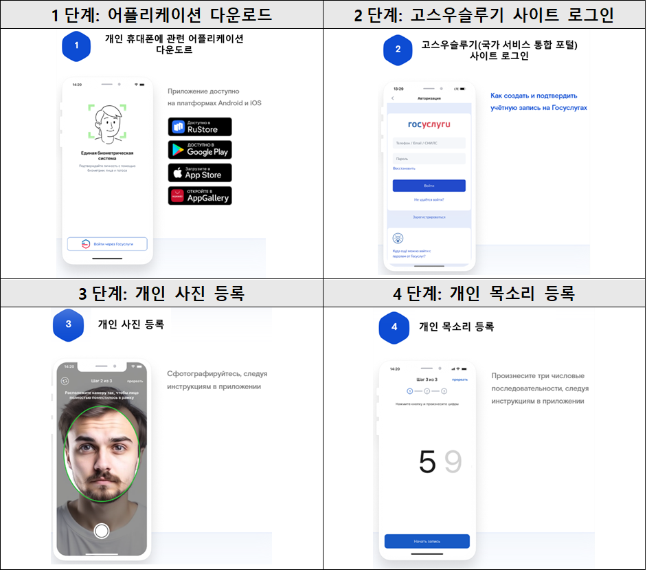 해당 시스템을 이용하기 위해서는 개인이 직접 운영사이트(https://ebs.ru/citizens/)에서 다음과 같은 절차를 통해 생체 정보(사진 및 목소리)를 등록해야 한다.