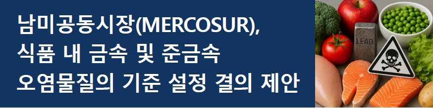 남미공동시장은 2023년 6월 23일, 「식품 내 금속 및 준금속 오염물질 최대 허용치에 관한 기술 규정(Resolución GMC Nº 07/23)」을 채택하였으며, 2025년 9월 19일, 우루과이가 WTO TBT 위원회에 공식 통보함(통지번호: G/TBT/N/URY/105). 해당 결의안은 회원국 자국 법체계에 편의해야 하며, 동시에 기존 결의안(GMC Nº 12/11 및 Nº 18/21)을 폐지함.