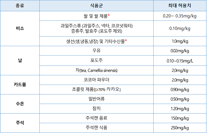 - 식품에는 정한 한도 내에서 금속 및 준금속이 존재할 수 있으며, 규정된 최대 허용치는 식용 부분 기준임.