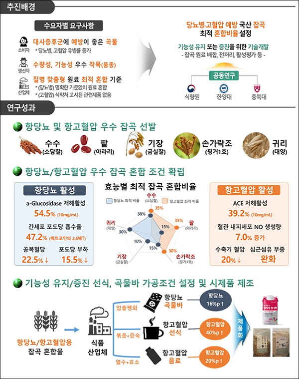 이에 농진청은 국내 주요 잡곡 가운데 항당뇨·항고혈압 활성이 우수한 품목을 선별하고, 과학적 검증을 거쳐 최적의 혼합비율을 설정해 특허등록을 완료했다.