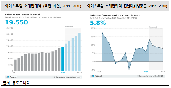 ● 2025년 브라질 아이스크림 시장은 폭염과 건강·웰빙 트렌드의 영향으로 안정적인 수요를 유지했으며, 2026년에는 소매 판매 성장률이 13.2%로 다시 가속화될 것으로 전망된다. 특히 저당, 유당 무첨가, 식물성 원료 등 건강 친화적 제품이 인기를 얻으며 시장 내 제품 다변화를 촉진했다.