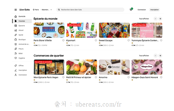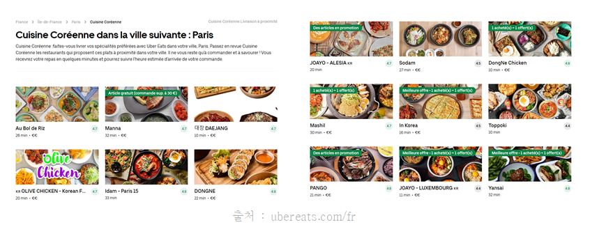 위의 그림 자료는 프랑스 주요 배달 플랫폼인 Uber Eats에서 ‘한식’을 검색하면 나오는 화면이다. 배달음식만 취급하는 배달 전문점보다는 매장 영업을 병행하는 한식당이 주를 이룬다. 매장 이름 옆에는 평점이 함께 노출되며, 1+1 같은 할인 행사를 확인할 수 있다.