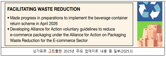 주요 내용으로는 1)첨단 농업 시스템 도입을 위한 펀드 확대, 2)국가 차원의 치어(稚魚) 양식 프로그램 개발 3)음료 용기 반환 보증금 제도 도입 등이 포함된다. 이러한 정책은 식품 산업의 생산·유통 전 과정에서 환경 영향을 최소화하고, 자원 순환 구조를 강화하기 위한 싱가포르 정부의 ESG 실천 의지를 보여준다.