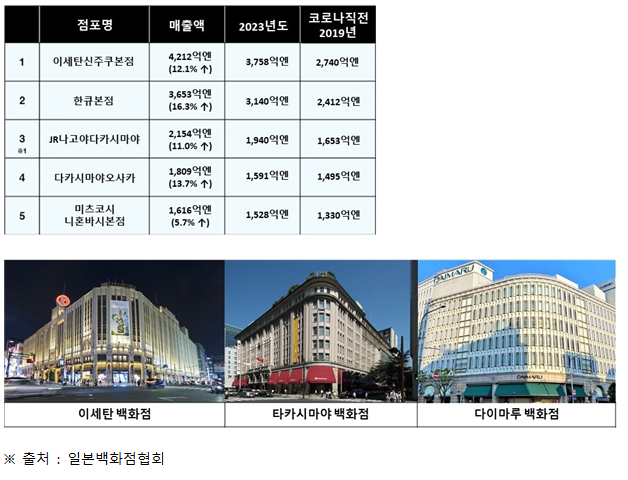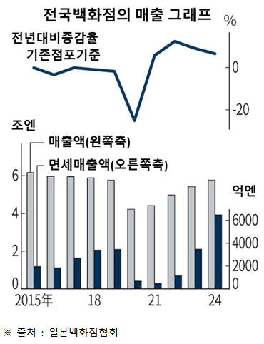 일본백화점협회가 발표한 2024년의 전국 백화점 매출은, 기존 점포를 토대로 전년 대비 6.8% 증가한 5조 7,722억 엔(약 54조 5,004억 원)이었다. 매출이 전년도를 넘어선 것은 4년 연속이며, 2019년과 비교해도 3.6% 증가하여, 코로나19 사태 이후로는 처음으로 코로나 이전 실적을 넘어섰다.